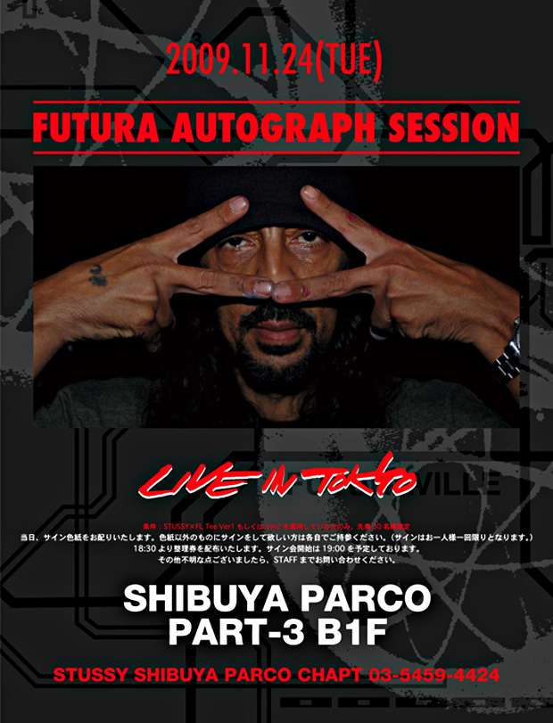 International graffiti artist Futura will be signing autographs at Parukochaputo in Shibuya on November 24 @ 18:30 as part of his on going Stussy collaboration. You have to be quick though as only the first 30 people to turn up in their STUSSY x FL Tee Ver.1 or Ver.2 will be allowed entry.