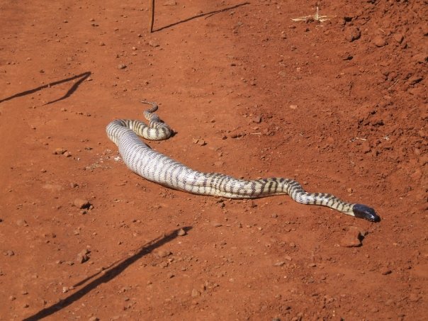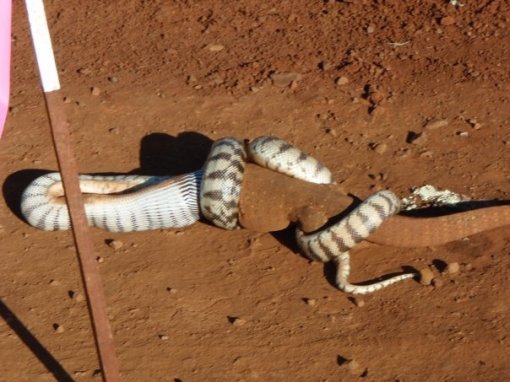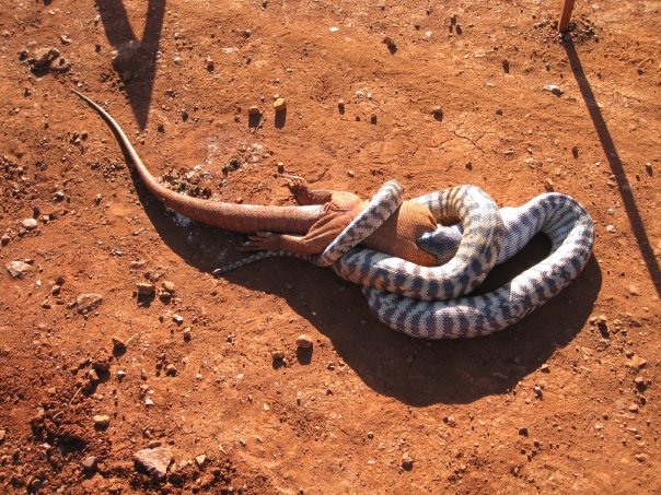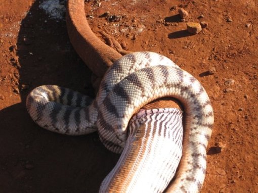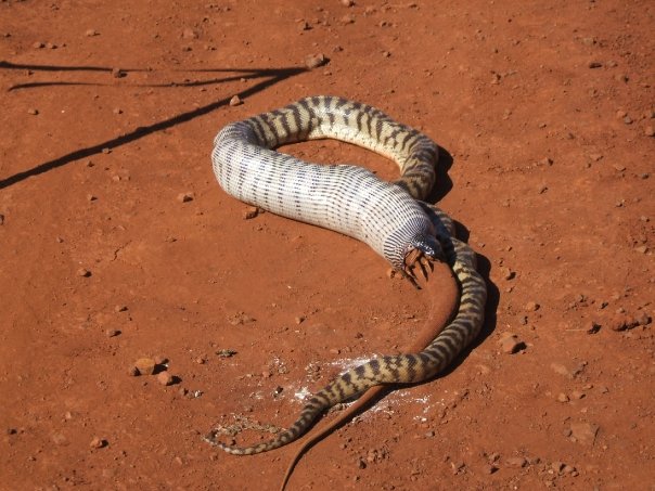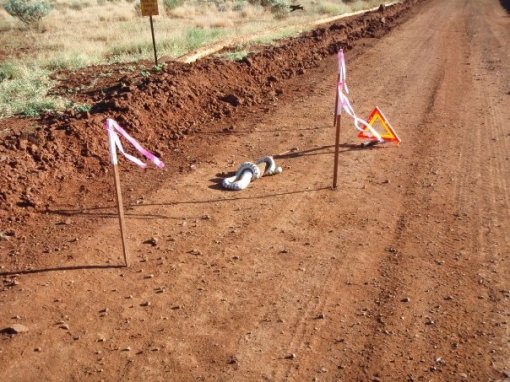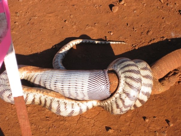 These pictures were taken by one of the road crew at Cooyar (North of Toowoomba, QLD) last week. It took a total of 5 hours for the snake to finish off the Goanna. As you can see, they put some signage up so it couldn’t be run over.