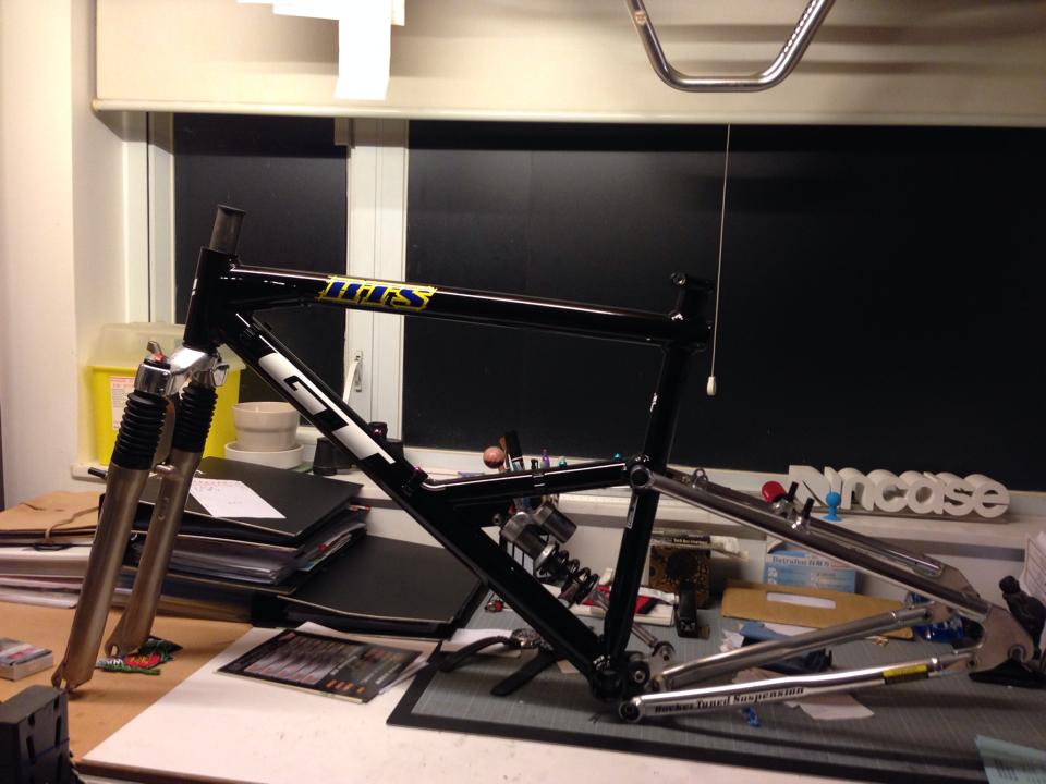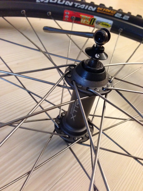 De-laced the original wheelset because the Azonic Worldforce rims still have plenty of life in them, just need to find some suitable hubs at an affordable price.. meanwhile thanks to Eric at CHRONiC BiKE who had a set of spare wheels in the shop, which are newer XTR M950’s laced to Mavic D521 rims, so I grabbed those to use for now until I get the old wheels laced. The Carbon Ti skewers are new. Still waiting for the frame to be painted, and waiting on some final parts to arrive to begin the build.