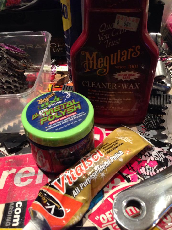 Continued cleaning up and polishing the crankset this evening, some people have been asking me what I use on Facebook so I thought I’d share the products here as well, I use 800-1200 wet and dry to get rid of the major pittings and scratches, then I use Vitalsol, followed by Meguiar’s Metal polish and finish with the cleaner-wax. There are no short-cuts it’s a matter of the more time you spend, the better the result.